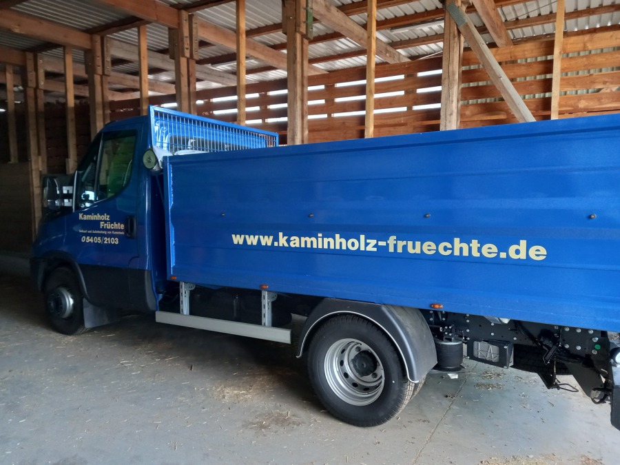 Mit unserem IVECO bekommen wir bis zu 6SRM auf einmal mit. Die Besonderheit bei diesem Wagen ist, dass das Holz nicht abgekippt sondern abgeschoben wird und daher auch ggf. eine Lieferung unters